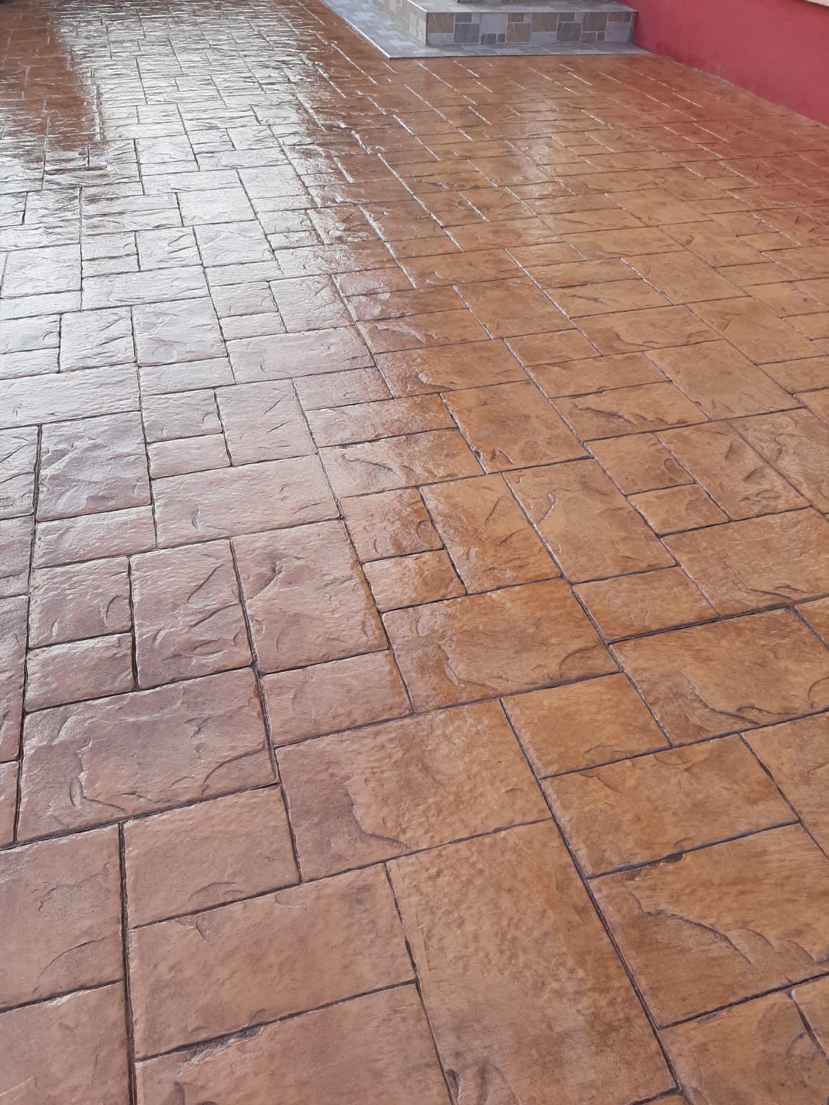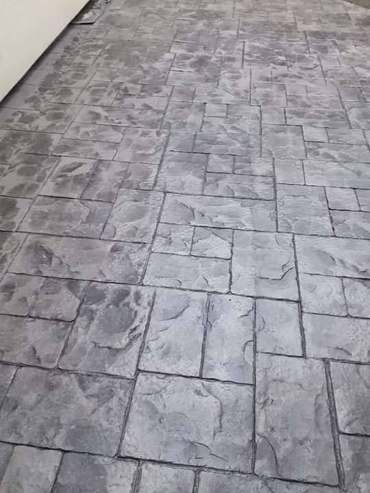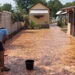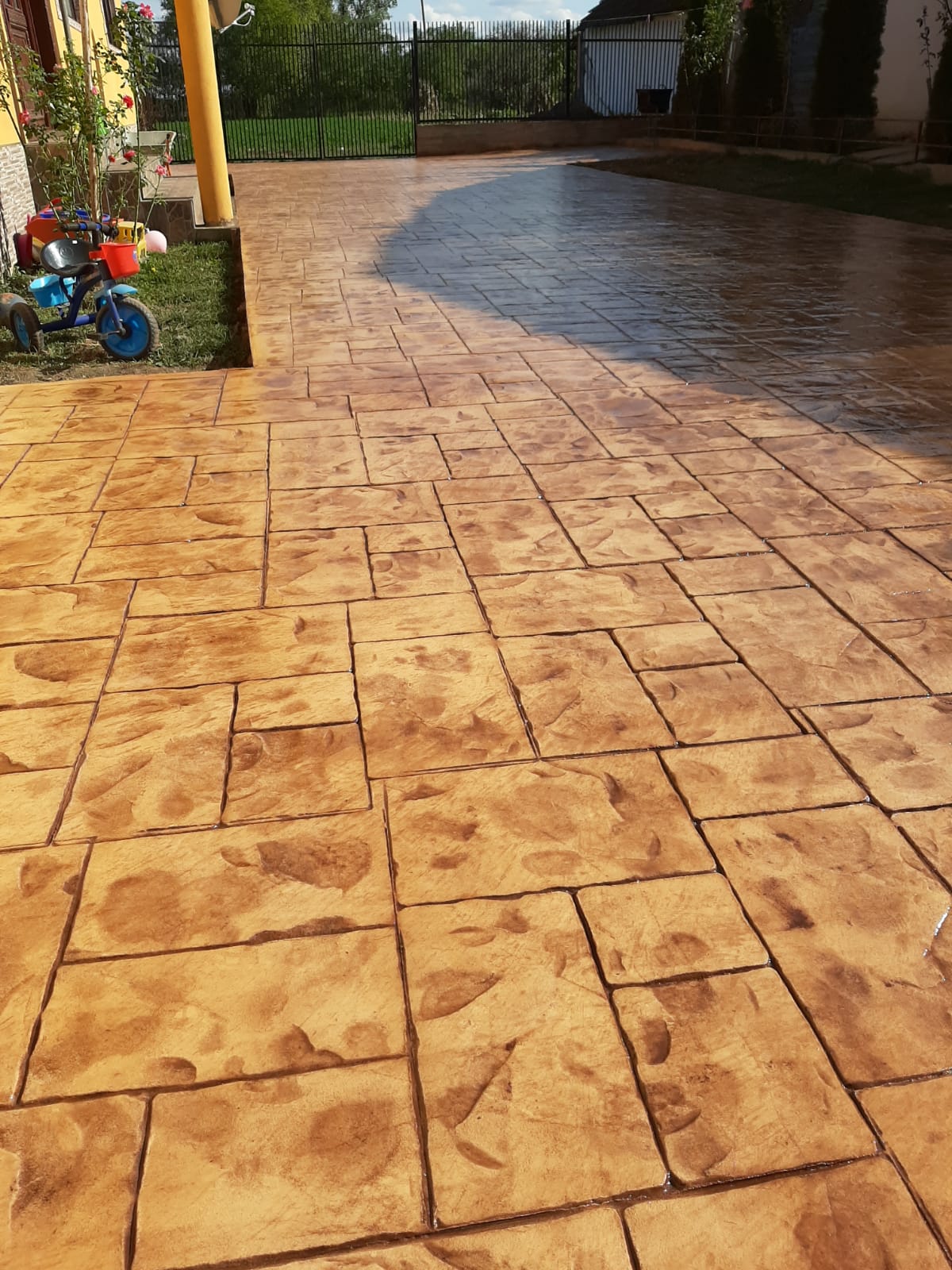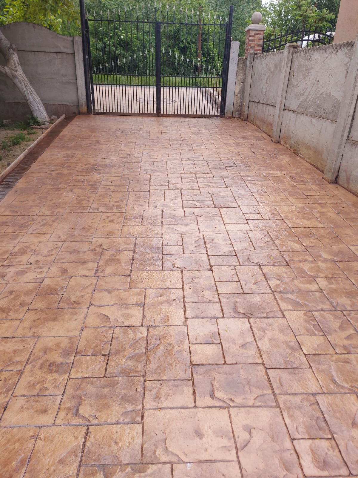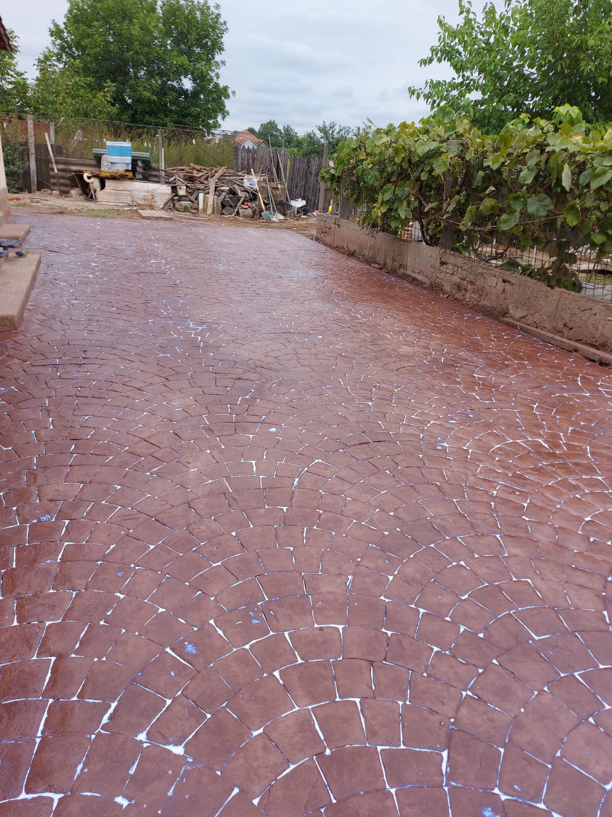 • Amprentarea – matrițele sunt presate pe betonul proaspăt, imprimând modelul ales